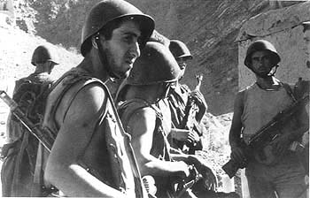 A patrol of Soviet motorized receive order in the last days before the evacuation of the Panjshir Valley in summer, 1988. The intense heat leads to the patrol wearing standard body armor without shirts.