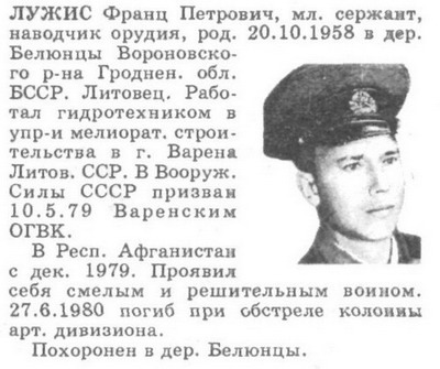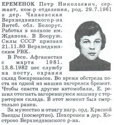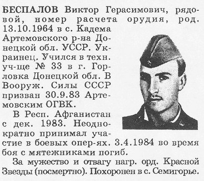 мл. сержант ВОЛЧАНСКИЙ Виктор Иванович (русский). 20.09.1964, м.р. Чечено-Ингушская АССР, Грозненский р-н, станица Первомайская. Работал трактористом в колхозе "1 Мая" Грозненского р-на. Водитель. Умер от полученных ранений 19.03.1984. Место гибели: Респ. Афганистан, провинция Герат, нас. пункт Торгунди. В вооруженные силы СССР призван 02.10.1982 Грозненским РВК. В Респ. Афганистан с 01.1983. Принимал участие в боевых операциях. В районе нас. пункта Торгунди провинции Герат колонна машин, в составе которой находился его автомобиль, была обстреляна. Действуя смело и решительно, на ходу ведя непрерывный огонь из автомата, первым прорвался через кольцо противника и проложил дорогу остальным машинам. Получил 4 ранения в грудь и голову, от ран и большой потери крови скончался . Награждён орденом Красной Звезды (посмертно). Похоронен в РФ, Чеченская респ., Грозненский р-н, станица Первомайская. Его именем назван поселок в станице Первомайская. |