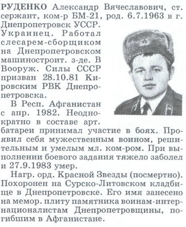 ефрейтор КУЧУК Валерий Ксенофонтович (молдаванин). 24.02.1963, м.р. Молдавская ССР, Лазовский р-н, с. Куболта. Работал в колхозе "Искра" Лазовского р-на. Номер расчета орудия. Умер от полученных ранений 02.01.1983. В вооруженные силы СССР призван 27.03.1981 Лазовским РВК. В Респ. Афганистан с 06.1981. Принимал участие в 9 боевых операциях и 5 сопровождениях автомобильных колонн. В боях действовал решительно и самоотверженно. Похоронен в Молдове, Лазовский р-н, с. Куболта. Его именем названа одна из улиц с. Куболта. |