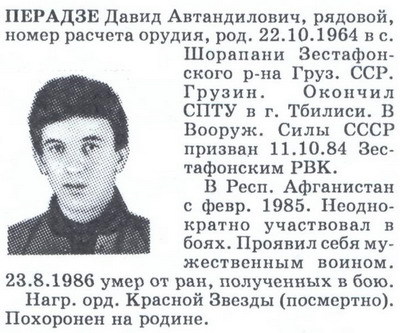 мл. сержант ПУШКАНУ Иван Харлампиевич (молдаванин) 31.03.1969, м.р. Молдавская ССР, Унгенский р-н, с. Макарешты. Командир отделения. Погиб в бою 28.10.1988 В вооруженные силы СССР призван 07.05.1987 Ненецким ОГВК Архангельской обл. В Респ. Афганистан с 10.1987. Принимал участие в боевых операциях в провинциях Герат, Гильменд, Кандагар. В боевой обстановке действовал бесстрашно и самоотверженно. Колонна, в составе отряда обеспечения движения которой он находился, была обстреляна реактивными снарядами. Пушкашу получил смертельное ранение в голову. Награждён орденом Красной Звезды (посмертно). Похоронен в Молдове, Унгенский р-н, с. Макарешты |