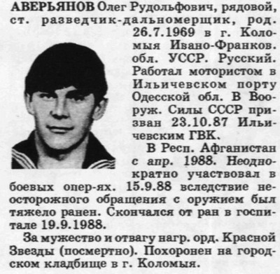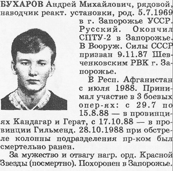 мл.с-т Одарич Сергей Михайлович русский, командир автомобильного отделения. 07.11.1967 Казахская ССР, Целиноградская обл. пгт.Вишневка (ошибся с Молдавией) призван 14.11.86., в Афганистане с мая 87г., погиб в пров. Кандагар 31.07.88г. медаль "За отвагу", орден Красной Звезды (посмертно) похоронен в Казахстане, Акмолинская обл. пгт.Вишневка |