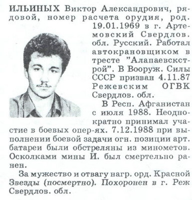 сержант Никитин Игорь Михайлович ком-р отделения, топогеодезист,род. 29.01.1969г. пос. Котово Нязепетровского р-на Челябинской обл.,работал в Ункурдинском леспромхозе Чел.обл. В ВС СССР призван 8.8.1987г. Нязепетровским РВК. В респ.Афганистан с июля 1988г. Неоднократно принимал участие в боевых операциях и в сопровождениях колонн. 30.11.1988г. при сопровождении колонны погиб в тягаче, который подорвался на мине. Награжден медалью "За боевые заслуги" и орденом Красной Звезды ( посмертно) . Похоронен в пос. Котово. На площади поселка ему установлен памятник. |
