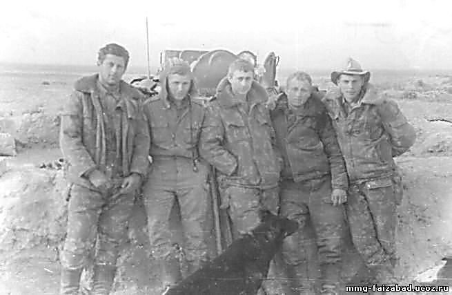 С этим экипажем я участвовал во всех операциях 1986 года, до моего дембеля. Слева направо Томченко Павел: (Тома) сапер, Дуенков Володя: механик-водитель нашего 734 БТРа, Бойко: сапер, Ющенко Владимир: наводчик, Цехмейстер Николай: инструктор мино-розыскной службы собак.