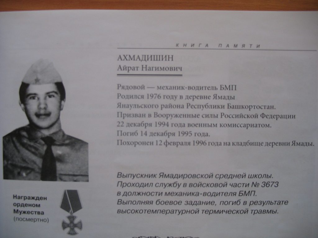 Вот эти данные были взяты с адреса http://heroes.comitet-z.ru/?p=723 : Ахмадишин Айрат Нагимович Звание: рядовой Место рождения/жительства: РБ, Янаульский р-н, д.Ямады Похоронен: РБ, Янаульский р-н, д.Ямады Рядовой – механик-водитель БМП Родился 1976 году в деревне Ямады Янаульского района Республики Башкортостан. Призван в Вооруженные силы Российской Федерации 22 декабря 1994 года военным комиссариатом. Погиб 14 декабря 1995 года. Похоронен 12 февраля 1996 года на кладбище деревни Ямалды. Выпускник Ямадировской средней школы. Проходил службу в войсковой части № 3673 в должности механика-водителя БМП. Выполняя боевое задание, погиб в результате высокотемпературной термической травмы. Награжден орденом Мужества (посмертно) |