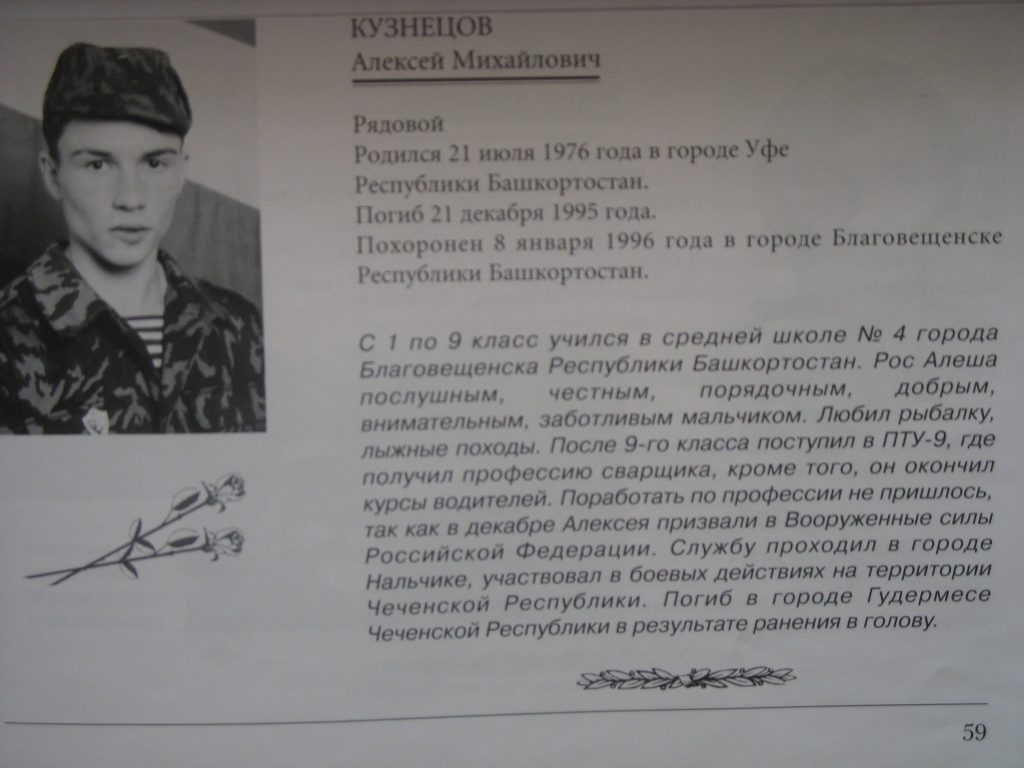 ![]() Вот эти данные были взяты с адреса http://heroes.comitet-z.ru/?p=431 : Кузнецов Алексей Михайлович Звание: рядовой Место рождения/жительства: РБ, г.Уфа Похоронен: РБ, г.Благовещенск Рядовой Родился 21 июля 1976 года в городе Уфе Республики Башкортостан. Погиб 21 декабря 1995 года. Похоронен 8 января 1996 года в городе Благовещенск Республики Башкортостан. ![]() С 1 по 9 класс учился в средней школе № 4 города Благовещенск Республики Башкортостан. Рос Алеша посушным, честным, порядочным, добрым, внимательным, заботливым мальчиком. Любил рыбалку, лыжные походы. После 9-го класса поступил в ПТУ-9, где получил профессию сварщика, кроме того, он окончил курсы водителей. Поработать по профессии не пришлось, так как в декабре Алексея призвали в Вооруженные силы Российской Федерации. Службу проходил в городе Нальчик, участвовал в боевых действиях на территории Чеченской Республике. Погиб в городе Гудермес. |