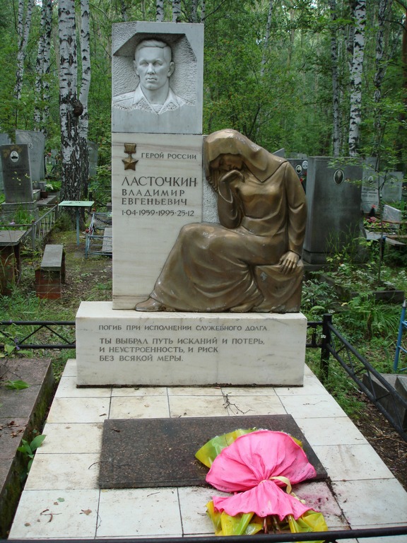 Выполнял воинский долг на территории Чеченской республики в составе войск МВД. Умер от ран 25 декабря 1995 года. Присвоено звание ГЕРОЙ РОССИИ. Похоронен в г. Екатеринбурге, на Сибирском кладбище. Майор милиции ЛАСТОЧКИН Владимир Евгеньевич, изображение №2 Родился 1 апреля 1959 года в Свердловске (ныне — Екатеринбург). Дед — Герой Советского Союза Михаил Кырчанов. В 1980 году окончил Свердловский педагогический институт и был призван на службу в Советскую Армию. После увольнения в запас поступил на службу в органы МВД СССР. Начал службу участковым инспектором ОВД Ленинского района Свердловска. С 1991 года командовал ОСпН «Россы» УИТУ, с 1993 года был заместителем начальника СОБРа при УВД Свердловской области. В 1994 году поступил на учёбу в Академию МВД России. С 1995 года Ласточкин был оперуполномоченным СОБРа ГУОП МВД России. 3 ноября 1995 года майор милиции Владимир Ласточкин уехал в Чечню в должности начальника штаба СОБР. За короткое время побывал во всех разбросанных по Чечне отрядах, устранил недостатки в обеспечении необходимым довольствием. Неоднократно попадал под обстрелы. Когда срок командировки Ласточкина подходил к концу, в бою за Гудермес погиб командир Свердловского СОБРа полковник милиции Леонид Валов. Его тело находилось в комендатуре Гудермеса, блокированной сепаратистами. Ласточкин решил, что не уедет домой, пока не вывезет тело Валова. 20 декабря 1995 года группа СОБРа и подразделения внутренних войск попытались прорвать оборону боевиков в Гудермесе. В бою Ласточкин выстрелом из подствольного гранатомёта уничтожил вражеский пулемётный расчёт, что позволило федеральным силам прорваться к комендатуре и начать эвакуацию раненых и вывоз тел убитых. Во время прорыва Ласточкин был ранен, но поля боя не покинул, продолжая вести бой. При эвакуации группа Ласточкина была атакована на окраине Гудермеса. Ласточкин был ранен осколком в голову и потерял сознание. Он был доставлен в госпиталь, но 25 декабря скончался от полученных ранений. Похоронен в Екатеринбурге на Сибирском кладбище. Указом Президента Российской Федерации № 1123 от 1 августа 1996 года майор милиции Владимир Ласточкин посмертно был удостоен высокого звания Героя Российской Федерации. Награждён орденом Мужества.